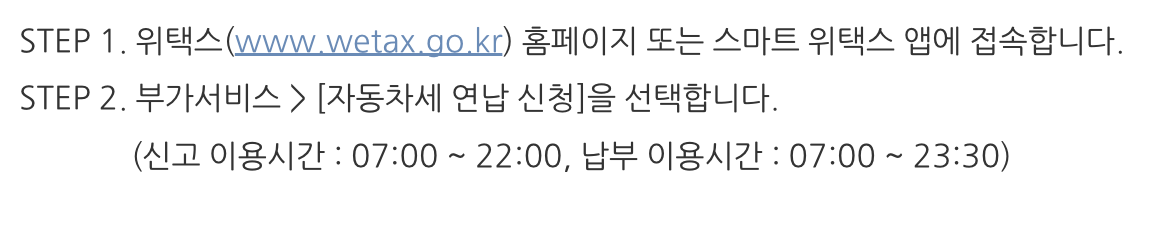 자동차세 연납신청 방법은 위택스 홈페이지 또는 스마트 위택스 모바일 앱에서 신청 가능합니다.